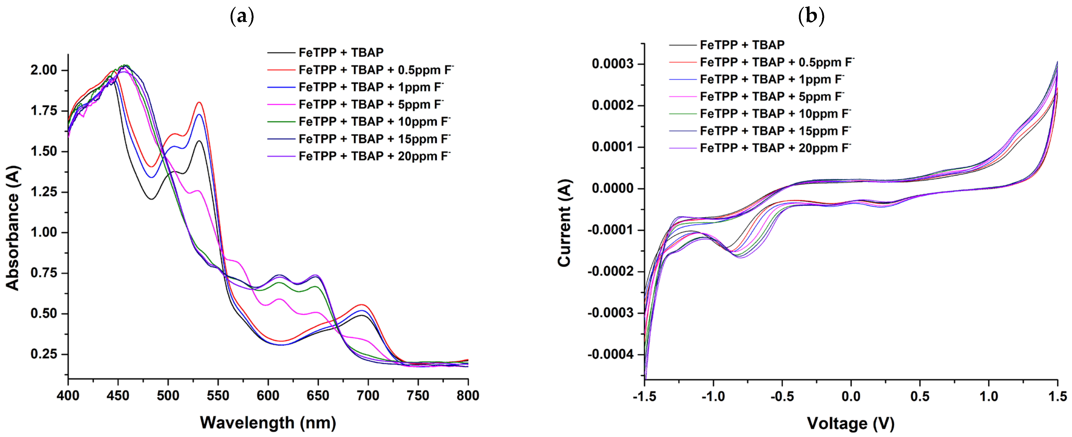 Figure 2a,b for fluoride concentration varying from 0.5 ppm to 20 ppm. The addition of TBAP resulted in the appearance of absorption bands around 505 nm, 531 nm, and 694 nm and the disappearance of absorption bands associated with Q-bands. These spectral changes are related to redox-active interactions with the Fe center in FeTPP, which can influence the metal’s oxidation state and the associated electronic transitions. Furthermore, with the addition of fluoride, the emergence of new peaks was observed at 614 nm and 649 nm, with the disappearance of the peak at 698 nm.