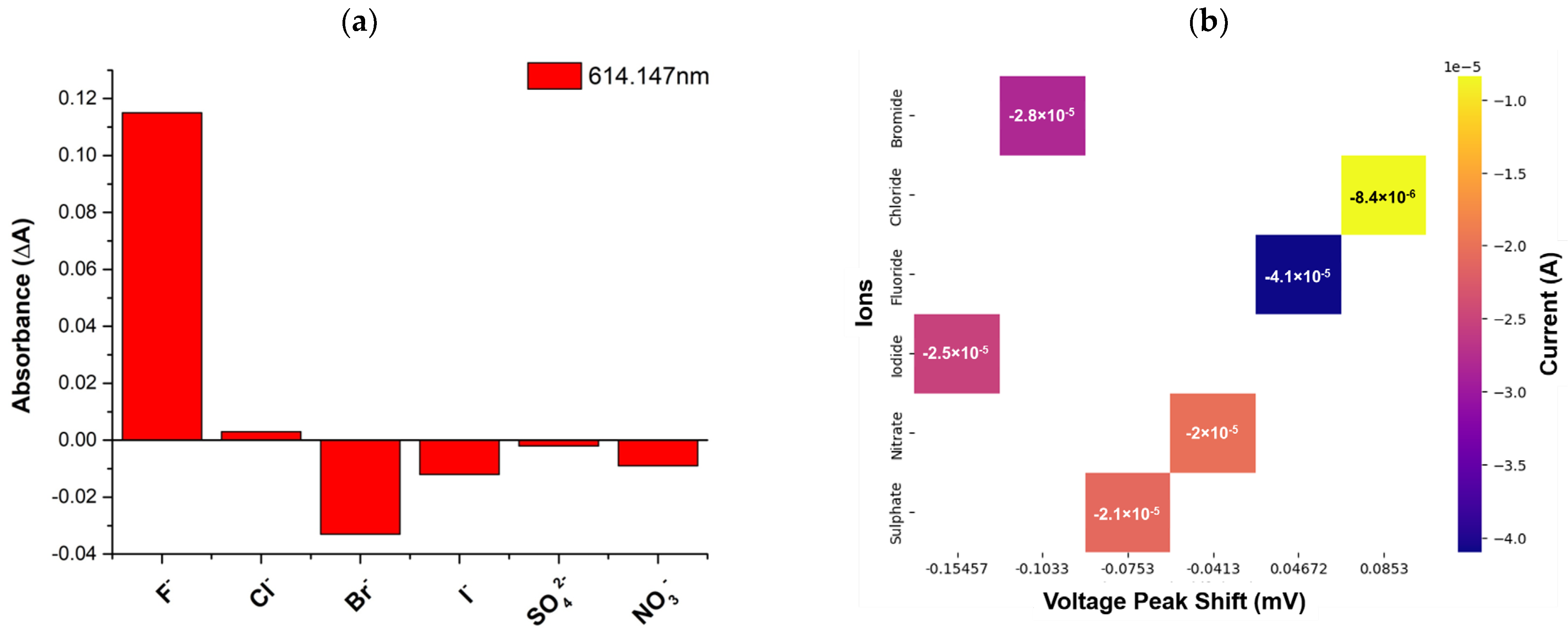 Figure 3b. It is evident that in the case of fluoride ions, there is a voltage shift along with a high magnitude of current as compared to other interfering ions. Thus, this helps to understand and distinguish different interfering ions in real-world scenarios. The use of the dual technique, i.e., electrochemical data embedded with spectroscopic data, helps avoid false alarms in complex interfering mixtures in real-world applications.