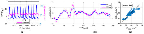 Visualization of (a) a 5 k sample PPG wave with a pressure signal measured in parallel, (b) determined HRPPG and HRFSR sequences, (c) a scatter plot with the calculated Pearson correlation coefficient Rcc.