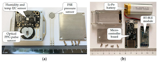 Construction of the PPG multi-sensor assembly: (a) photo of a measuring sensor part; (b) photo of a sensor’s body, including a Li-Po battery.