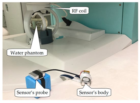 The quality of wireless communication was evaluated in the open-air MRI device E-scan Opera by Esaote S.p.A., Genoa, Italy, working with a low-static magnetic field of 0.178 T, which is located at our Institute [17]. The tested multi-sensor was present inside the scanning area of the MRI device, while the control laptop was located outside the shielding metal cage. No person was investigated for the purpose of this measurement; only a spherical water phantom (a plastic cube simulating a human wrist with the measuring probe fixed on it by a polyamide ribbon) was inserted in the RF receiving/transmitting coil—see the detail in Figure 3. The distance between the sensor and the control device was about 2.5 m, and the BT communication was operated at a rate of 57,600 bps. Within the third testing condition, the MR scan 3D-CE sequence was executed [17]. The intensity of the BT signal was evaluated by the RSSI parameter as a measure of the power level received by an RF client device from an access point [18]. The RSSI values in dBm were obtained during the BT BLE connection establishment process. The mean and std RSSI values under all three tested operating conditions (shown in Table 1) were always determined from five consecutively realized individual measurements.