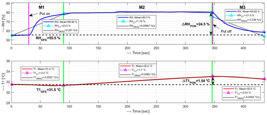 - The first 90 s measurement phase M1, when the RH and T1 values were taken in the intervals of TINT = 1 s. In the first 30 s of this duration, the measuring probe was freely laid on the desk (current air conditions were measured), and then the probe was put on the wrist of the tested person. At this moment, the offsets of RH and T1 sequences (RHOFS and T1OFS) were determined.
