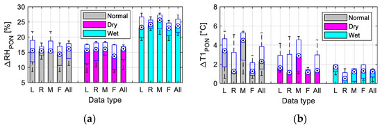 The obtained results of the realized main measuring experiments show that the performed skin manipulation (skin drying and/or moistening) was well detectable—see the changes in the ΔRHPON parameter in Figure 6. As can be seen, when moistening was applied, the highest ΔRHPON values were achieved. From the point of view of ΔT1PON parameters, the situation was the opposite—moistening produced the smallest values. The detailed analysis performed separately for each hand and gender indicates that differences existed in ΔRHPON values between the results of the male and female subjects, but the results of measurements from the left and right hands differed less (not significantly). In the case of the ΔT1PON parameter, the obtained values differed significantly for each gender as well as each hand. These conclusions must be confirmed by further experiments—at present, a small number of measurements on subjects were realized (four males and three females only).