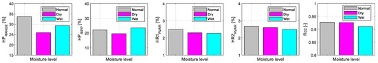The following example describes the determination of PPG signal properties, together with parameters of RH and T1 sequences, taken from the right hand of the male testing subject P2M at the wet skin moisture level. Concatenated RH and T1 sequences for the measuring phases M1–3, with denoted time stamps indicating when the measuring probe was put on and taken off, the determined offset levels RHOFS and T1OFS, and final span changes ΔRHPON and ΔT1PON can be seen in Figure 5. Table 2 enumerates partial results for all three tested skin moisture levels. Bar graphs with box plots in Figure 6 compare differences in ΔRHPON and ΔT1PON parameters for three skin moisture levels, categorized by the used hand and the gender of the tested person separately. Figure 7 presents summary mean results for all tested subjects, visualized as bar graphs that track changes in the five most important PPG signal properties—HPRANGE, HPRIPP, HR relative variance (HR1 from HRPPG, HR2 from HRFSR values), and Rcc.