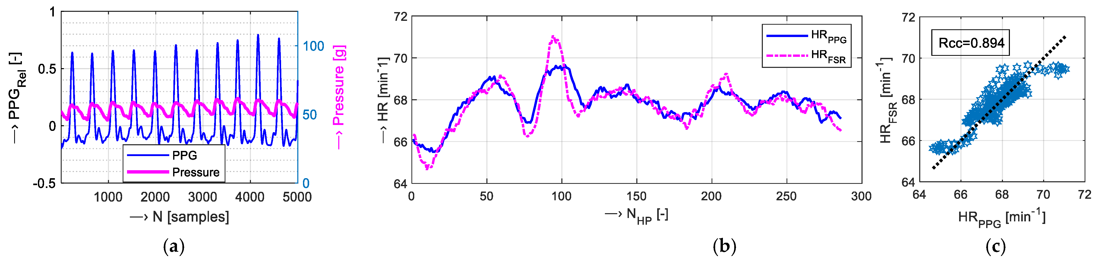 HRFSR) can be successfully calculated from the FSR signal. To evaluate the correlation between heart rates determined from the PPG signal (