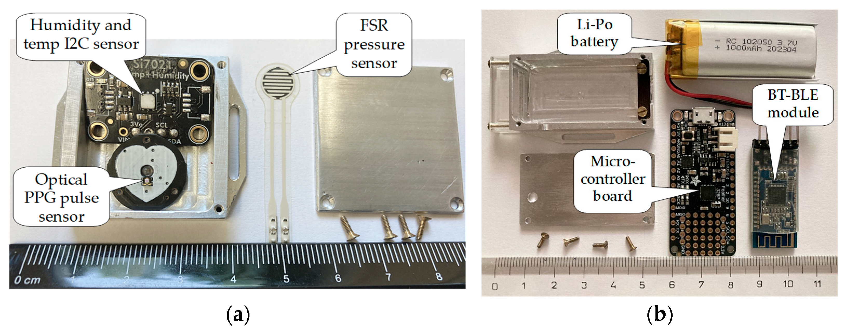 The sensor’s body part consists of an Arduino-compatible micro-controller board, Adafruit Feather 328P, by Adafruit Industries, New York, NY, USA, based on the processor ATmega328P by Atmel Corporation, San Jose, CA, USA. This processor includes eight 10-bit ADCs; it works with an 8 MHz clock frequency and uses 3.3 V logic. The Arduino board also contains integrated chips for I2C and SPI support, a hardware USART to USB converter, and a charger for lithium polymer (Li-Po) batteries [