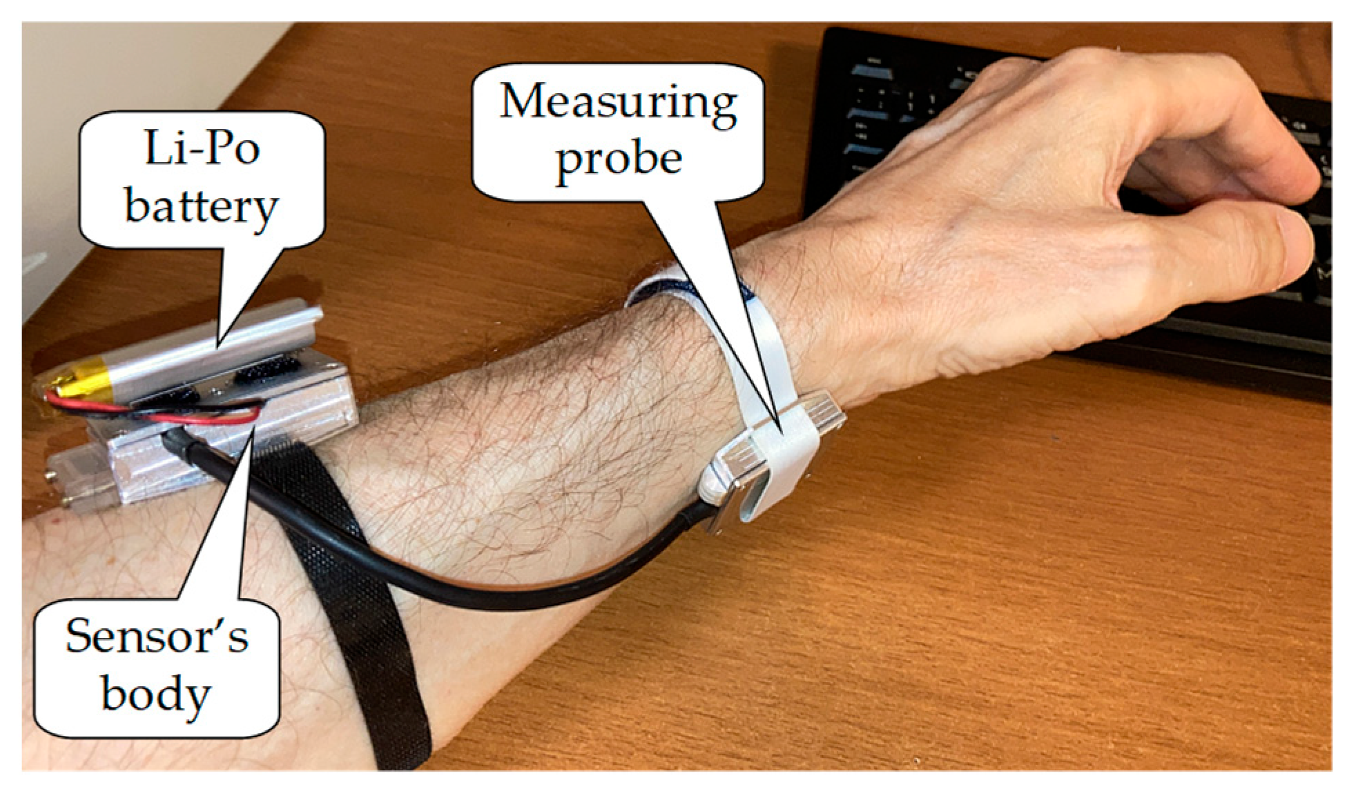 The main measurement experiment consisted of real-time sensing of PPG waves, humidity values, and temperature values, together with the information about the current contact pressure applied on the skin surface by a measuring probe. The tested person sat with a hand on a table in a normal office room. The measuring probe was placed on the wrist artery of the left or right hand, while the sensor’s body was fixed on the upper arm (see the arrangement photo in
