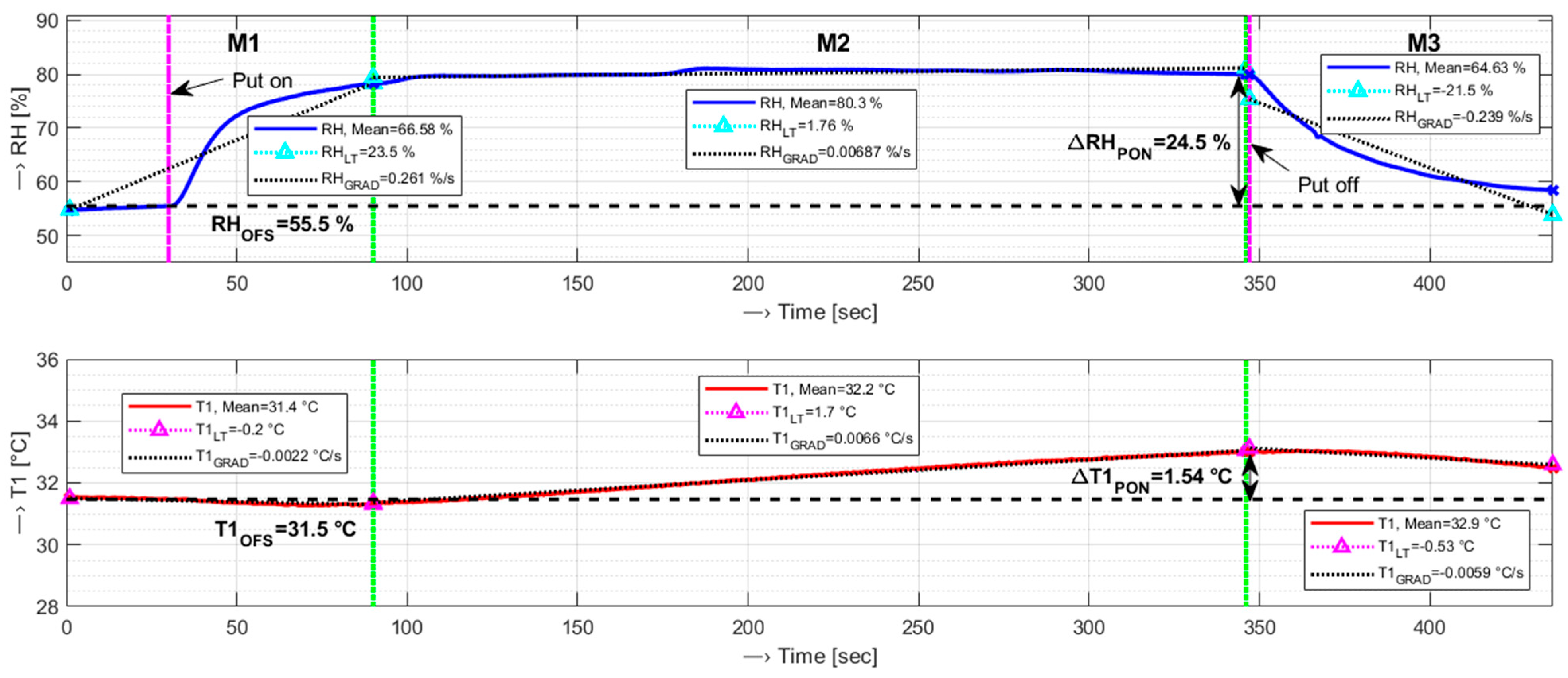 As confirmed by visualization of the concatenated RH and T1 sequences for the measuring phases M1 and M3, the 90 s time duration was chosen properly—during the main measuring phase M2, the changes in RH were minimal (see the upper graph in