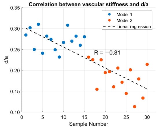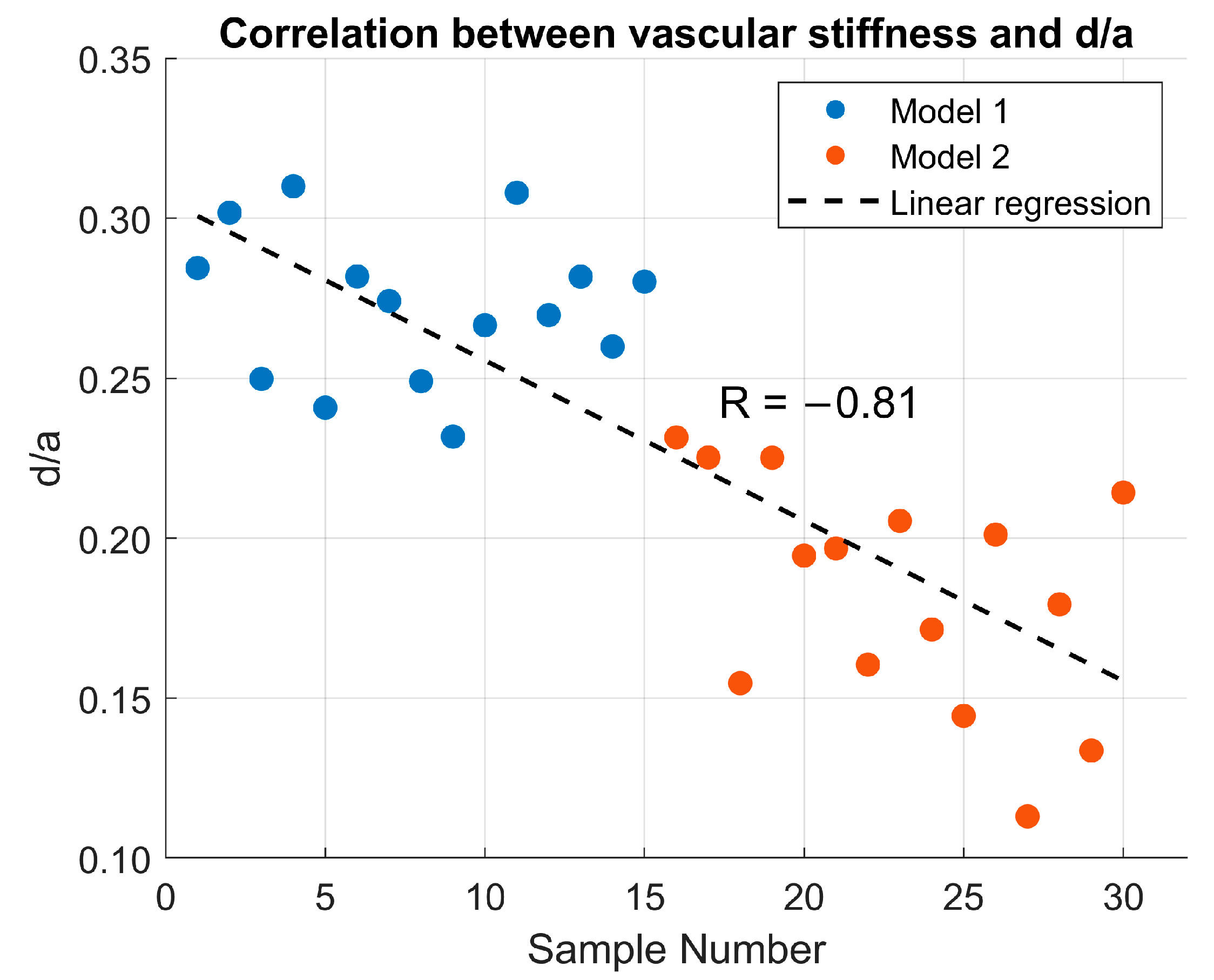 Figure 2 shows the correlation between the d/a ratio and vascular stiffness in the in vitro study using two silicone phantom models. Model 1 (physiological) exhibited a mean d/a value of 0.277 ± 0.036, while Model 2 (pathological) showed a mean value of 0.183 ± 0.036. Linear regression analysis yielded a correlation coefficient of R = −0.81, indicating a strong negative correlation between vascular stiffness and the d/a ratio.