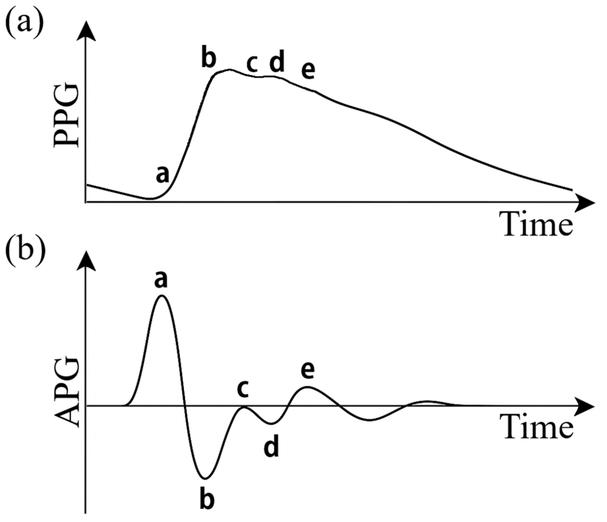 Figure 1b) highlights inflection points and rapid changes in the wave, allowing more precise detection of morphological details that are often difficult to detect in the raw signal. APG provides information on the structural and functional properties of both large caliber and peripheral arteries and has been widely used for the assessment of vascular stiffness and aging [