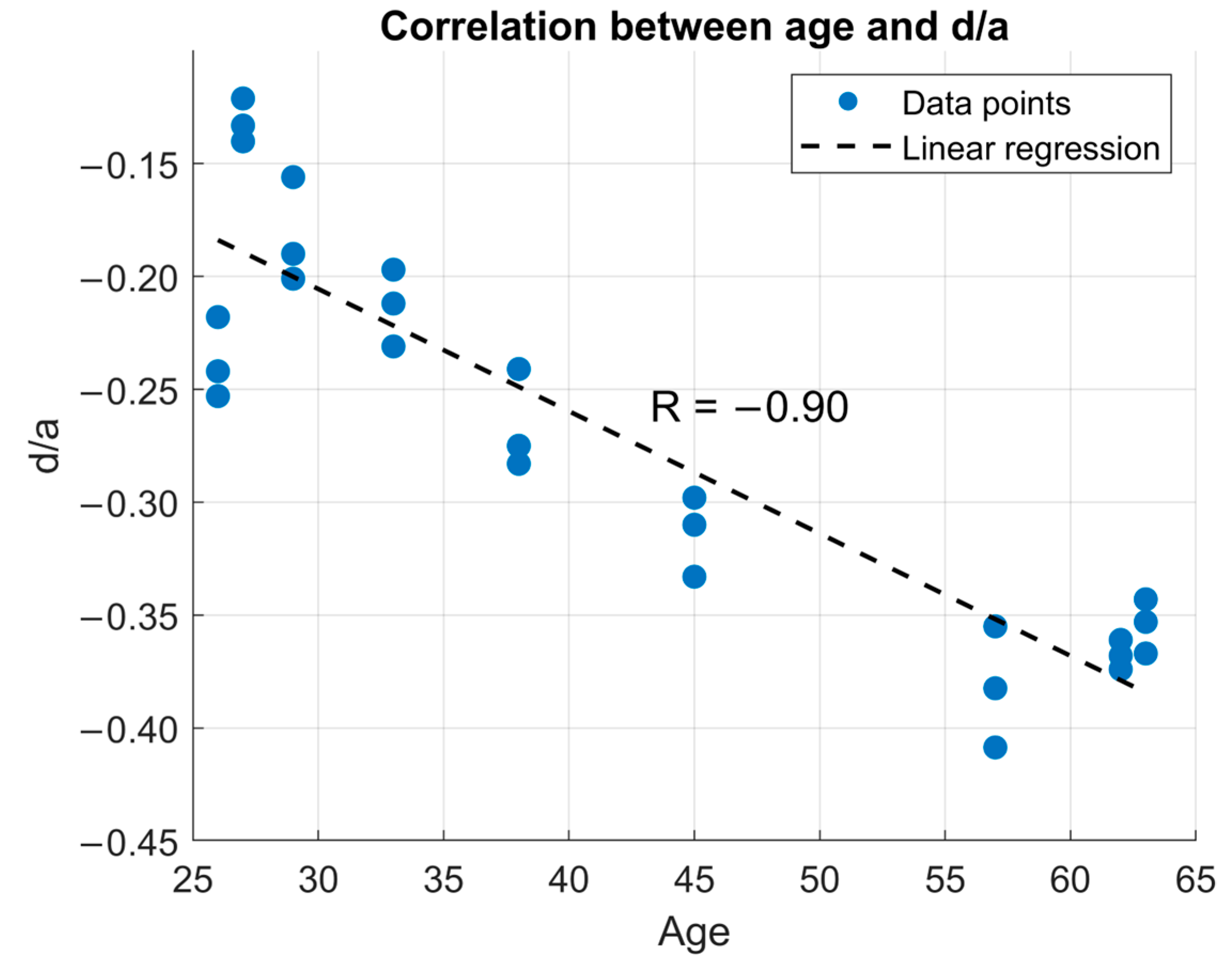 Figure 3 presents the correlation between age and the d/a ratio in the in vivo study. Participant ages ranged from 26 to 63 years, with corresponding d/a values ranging from −0.120 to −0.410. Linear regression analysis revealed a correlation coefficient of R = −0.90, confirming a strong negative correlation between age and the d/a ratio.