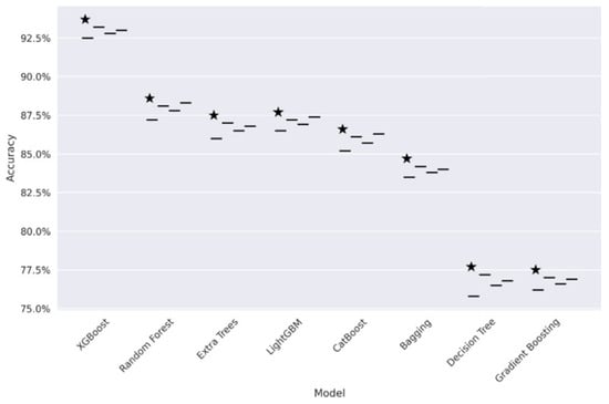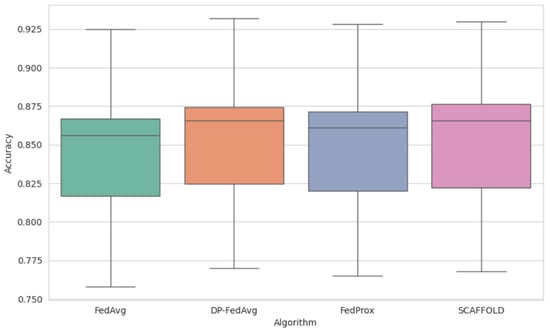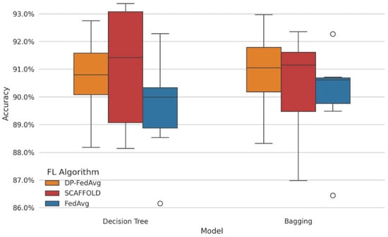 Figure 5 presents the comparative study of FL models’ performance. We conducted a performance analysis of all the tree-based algorithms in privacy-constrained environments. It has been observed that DP-FedAvg obtained the highest median accuracy (93.2% for XGBoost). The model obtained the lowest minimal variance (±0.5%) while considering FedAvg, FedProx, and SCAFFOLD across all models. The star represents the highest score.
