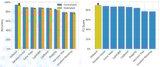 Figure 3 presents the comparison of centralized and federated learning models and emphasizes the performance metrics, accuracy, and F1-score. It has been observed that XGBoost performed well in centralized as well as federated environments, i.e., the decrease varies from 1 to 3%. The centralized model, XGB, obtained 94.5% and the FL model obtained 93.2 ± 0.5%. This marks the best-performing model and indicates that the model is suitable for federated health data. The above-mentioned figure discusses how FL impacts the models and establishes the relationship between precision and recall. The XGBoost model obtained an F1-score of 0.89, which helps handle the class imbalance issues. We used four FL algorithms to achieve the early diagnosis from the sensor data, and these algorithms were FedAvg, DP-FedAvg, FedProx, and SCAFFOLD. Experimental work revealed that DP-FedAvg performs well for privacy-sensitive data. The yellow shaded bars represents the proposed hybrid model. It is used for comparison of the individual models. The yellow bar presents the highest accuracy obtained through the proposed model. The right hand side plot designates for F1-score and the yellow bar presents the best F1-score.