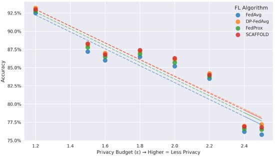 In Figure 6, DP-FedAvg maintains >92% accuracy even at severe privacy budgets (ε = 1.2–1.8), while other algorithms exhibit sharper accuracy deterioration (FedAvg: −2.1% and SCAFFOLD: −1.7% at ε = 1.5). Subplot (b) analyses the privacy–accuracy trade-off. The trend lines showing a negative correlation between accuracy and ε, which validates that DP-FedAvg strikes the optimal compromise between model utility and differentiated privacy guarantees. All of these findings point to DP-FedAvg as the best option for federated health applications.