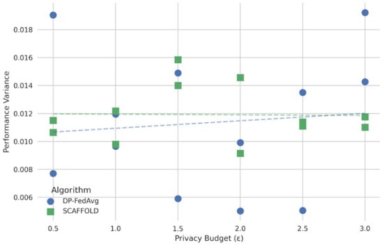 In Figure 8, the x-axis represents the privacy budgets and the y-axis performance variance. The figure’s curve illustrates a non-linear connection in which poor privacy enforcement keeps variance low (i.e., high accuracy and low F1-score variability), but variance abruptly rises above a particular level of privacy assurances. With minimal encryption, XGBoost maintained an acceptable variation among federated nodes while achieving 94.53% accuracy and an F1-score of 0.9043. As shown in the graph, as the level of privacy increases (e.g., higher noise injection or stronger encryption protocols), the model’s predictive variance also tends to increase, reflecting a decline in performance stability and generalization.