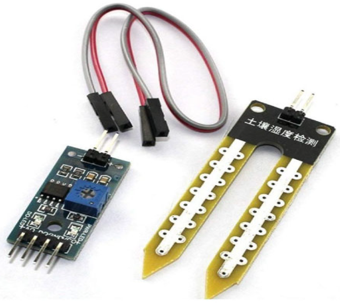 Figure 2, is employed with Arduino in this study. This module is leveraged with two metal probes, which can withstand corrosion and conduct electricity reliably; to identify the volumetric water content in soil, they act as variable resistors. Soil moisture and conductivity are inversely proportional to resistance between the probes. In contrast dry soil demonstrates higher resistance that indicates lower moisture levels.