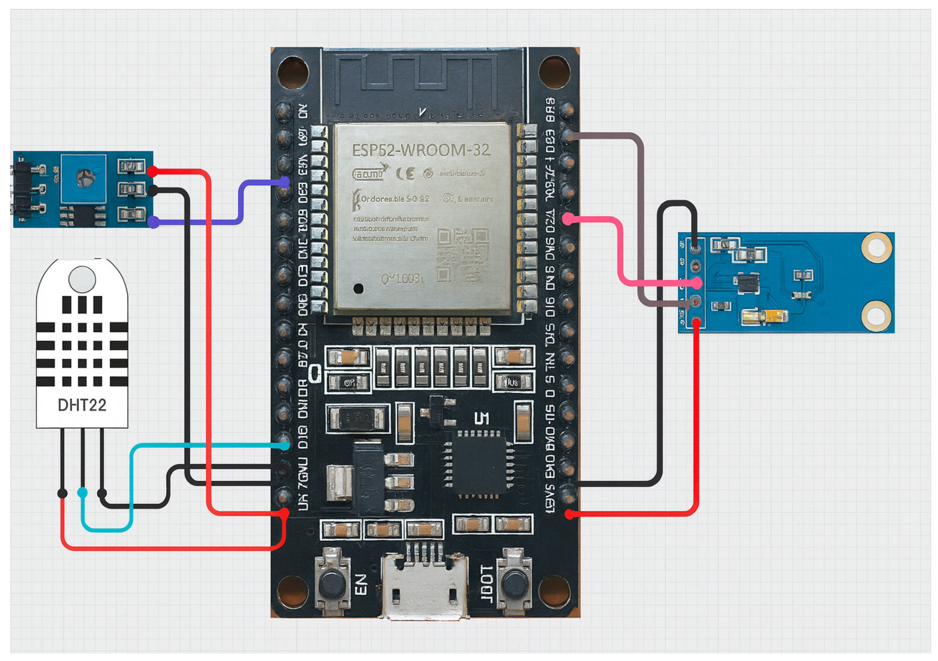 The sensors are connected to the ESP32 module. The device is connected through a USB wire to a power supply, which provides 5 V. The positive and negative pins of the sensors are connected to the 3.3 V and GND pins of the ESP32 board, respectively. Further, the sensors and the microcontroller are placed on an electronic board for the common negative and the positive terminals. The digital output (DO) pin of the soil moisture sensor is connected to the GPIO 34 of the microcontroller, as shown in