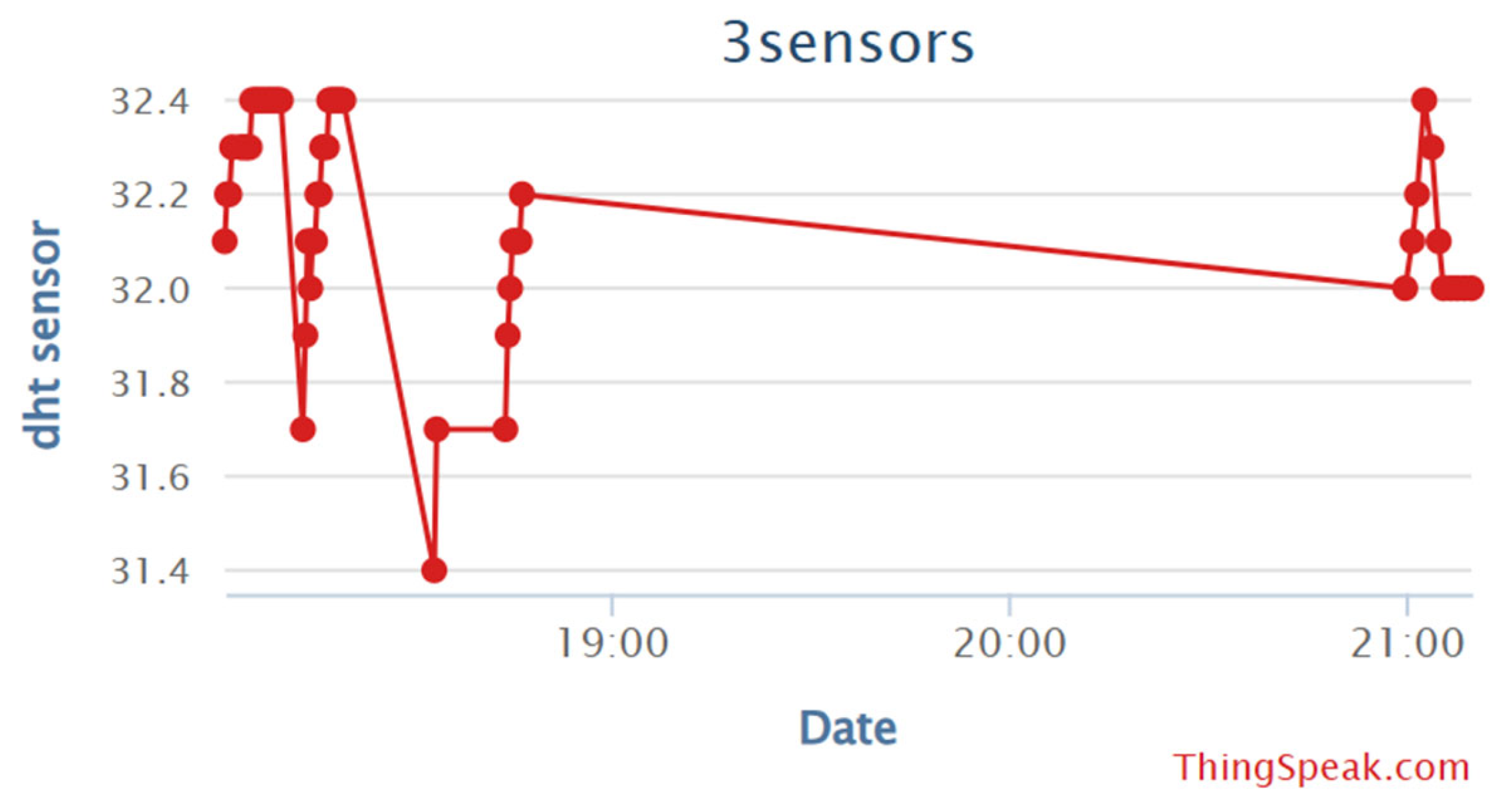 In addition to this, the Wi-Fi and ThingSpeak library are installed to monitor the values as a graphical representation. The graphical visualization aids in understanding the changes in parameter according to time. The sensor values update every minute. This helps with tracking the crop conditions. The ideal values for temperature range from 20 to 30 degrees Celsius and 40 to 70 percent humidity. The temperature and moisture content of the field vary according to the type of crop grown [