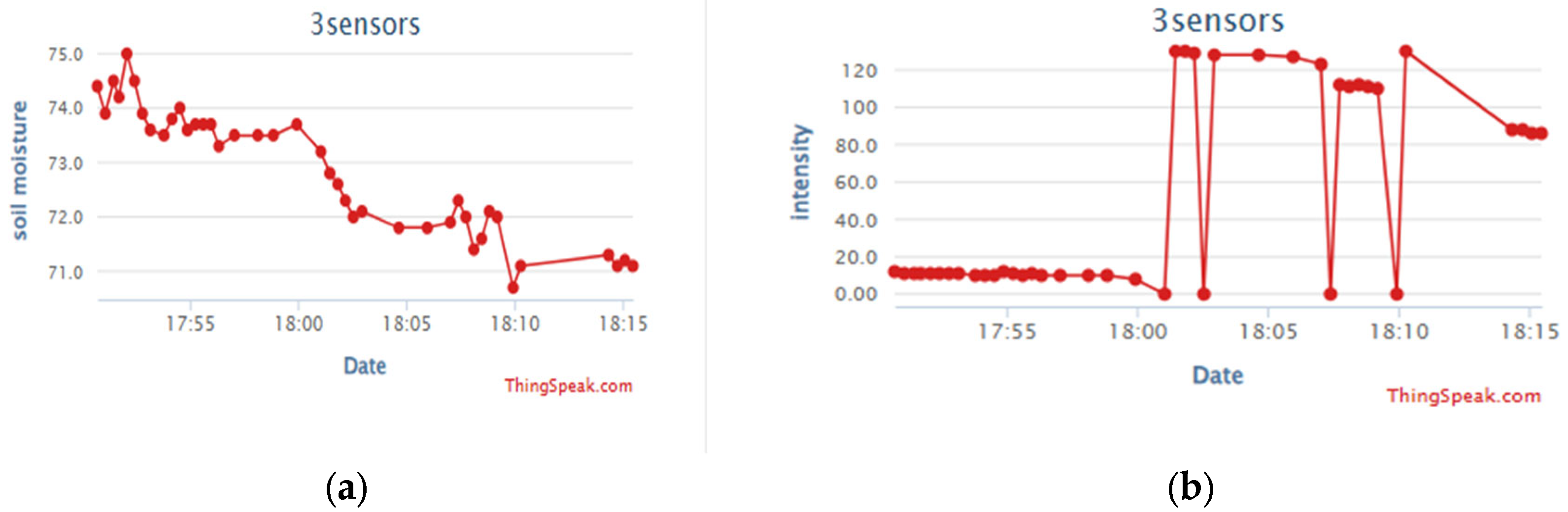 This work is accomplished on a normal sunny day, which tends to influence the soil parameters. The soil moisture descends from 75% to 71% in a span of 20 min, which indicates the need for irrigation. As the intensity graph depicts, the light intensity eventually increases during the recording interval. Consequently, there is a deviation in the temperature and humidity values, which is represented by