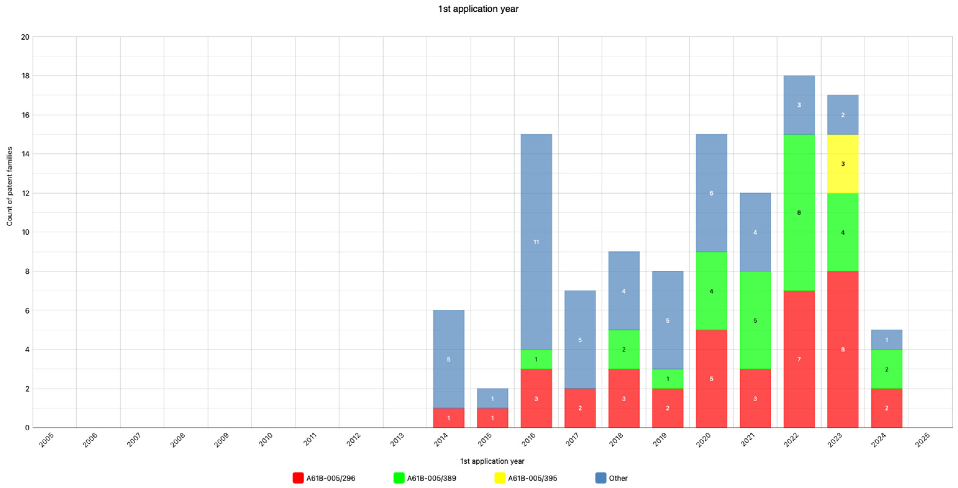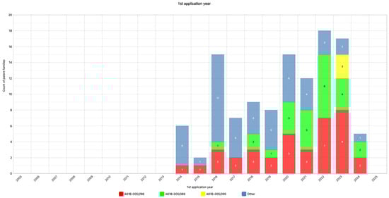 Figure 2) displays four peaks, indicating the periods during which the majority of applications were submitted. The number of applications received in 2016 was 15; in 2020 it was 14; in 2022 it was 18; and in 2023 it was 17. Data regarding subsequent years is incomplete, as patent applications are typically kept confidential for 18 months following the filing date. The data are segmented according to the primary IPC/CPC codes employed in the patent search.