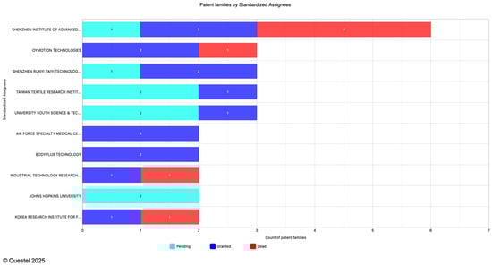 Figure 3, the majority of the top applicants per number of filed patents or patent applications are universities or research public entities. The Shenzhen Institute of Advanced Technology has been designated as the leading institution in this field, with a total of six patent families, of which one is pending, three have been granted, and three have been rejected. According to the most recent data available, OYMotion Technologies Co., Ltd. (high-tech startup in Shanghai, China) is the second-leading entity in terms of granted patents, with a total of two patents granted to the company. In addition, OYMotion Technologies has one patent that has been rejected or abandoned. A third-place ranking is shared by three entities: Shenzhen Runyi Taiyi Technology Co., Ltd. (headquartered in China Guangdong Province), Taiwan Research Institute, and South China University of Technology, each of which possesses three patent families.