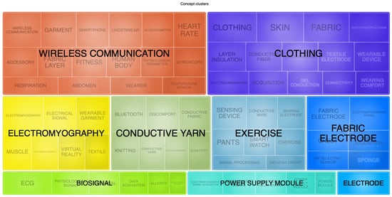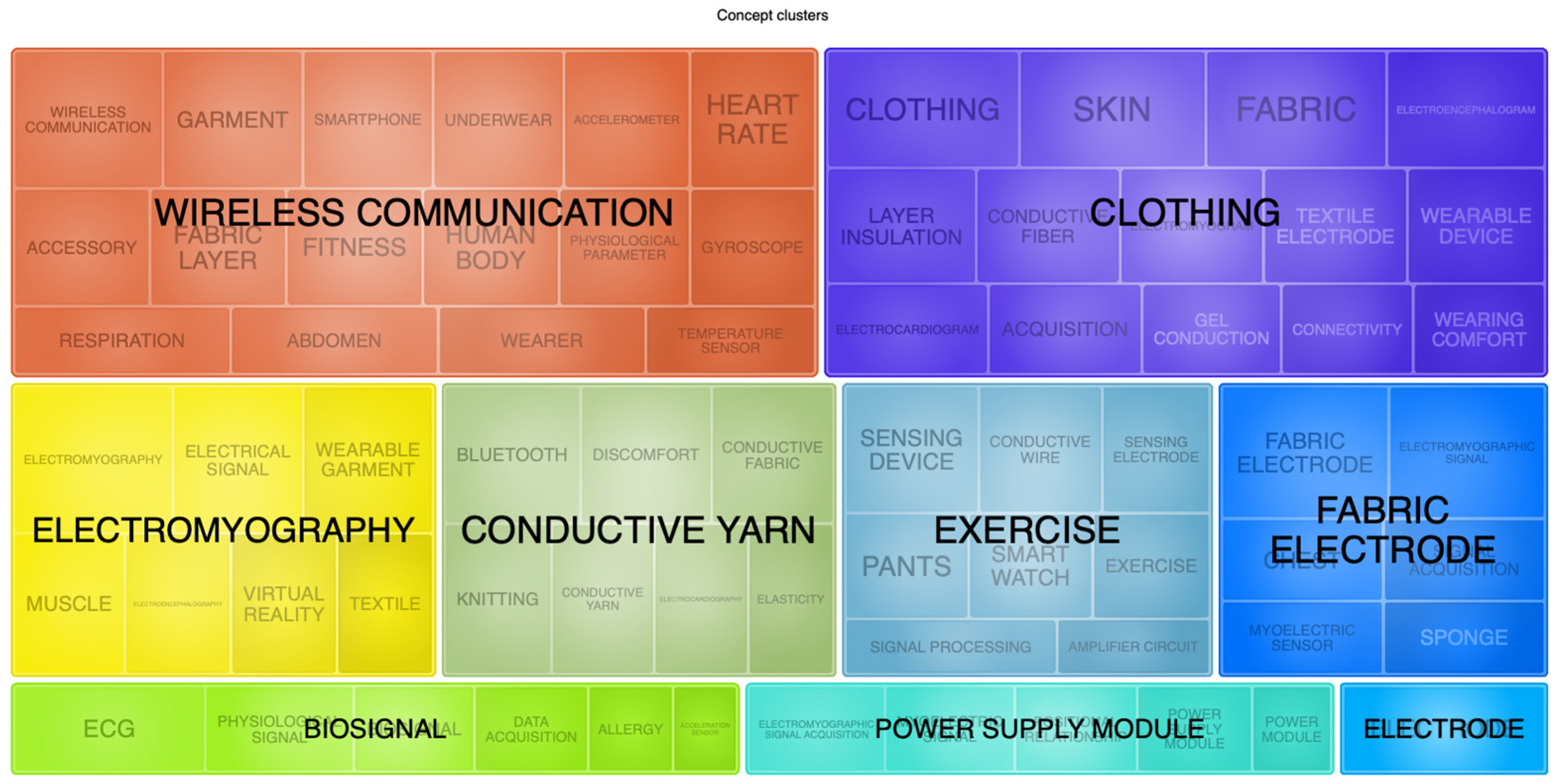 Figure 6 illustrates the distribution of the main concepts derived from the retrieved patent documents. A total of nine clusters have been identified: wireless communication (64 documents), clothing (80), EMG (52), conductive yarn (57), exercise (41), fabric electrodes (62), biosignals (47), power supply modules (32), and electrodes (8).