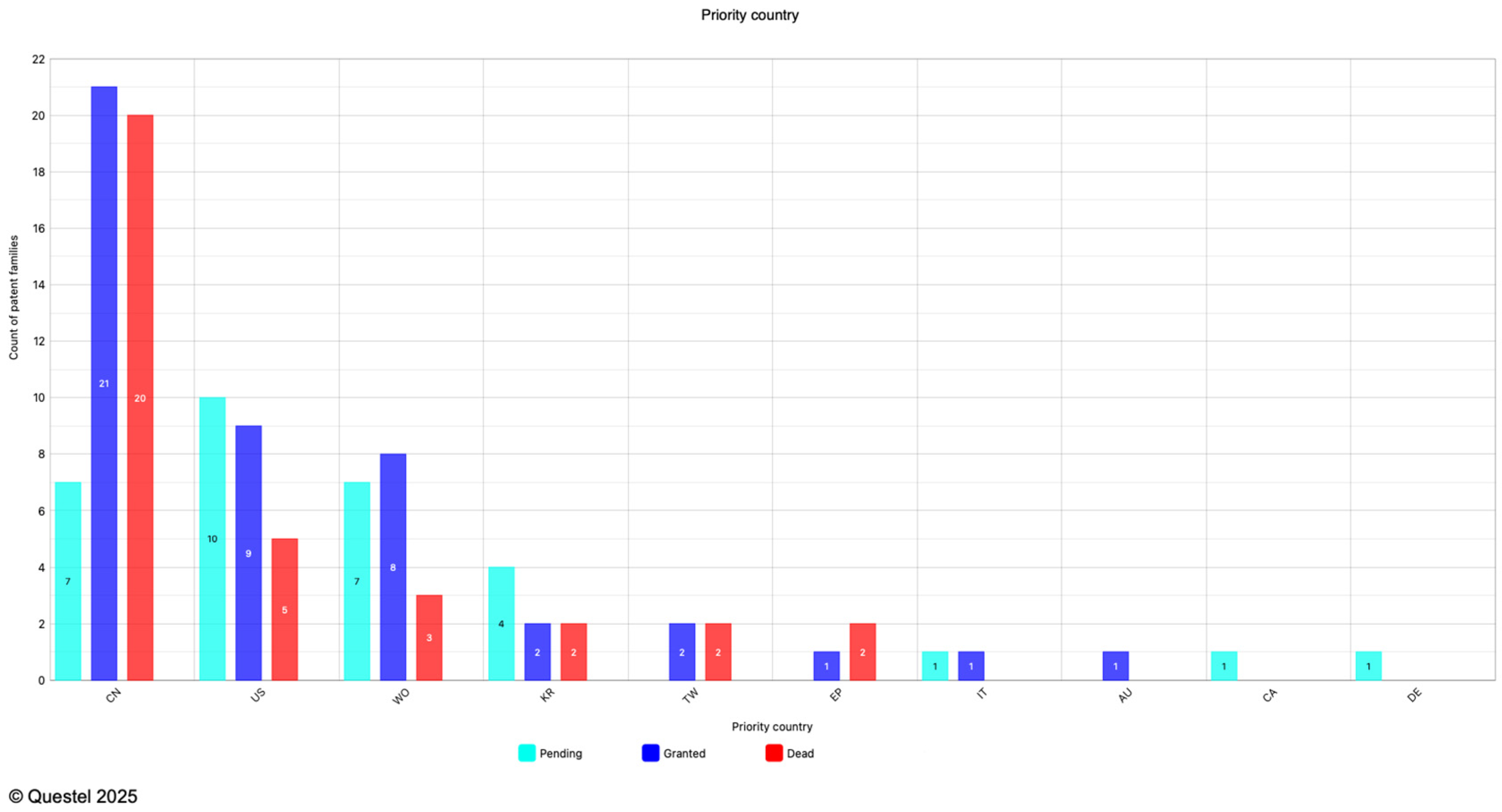 A total of 48 filings were submitted in China, including 7 pending applications, 21 granted patents, and 20 rejected or abandoned applications. In comparison, in the United States 24 filings were submitted, comprising 10 pending applications, 9 granted patents, and only 5 rejected or abandoned applications. From the perspective of patents that are currently active, the discrepancy in distance between China and the USA is less pronounced. South Korea is in third place, with eight filings (four pending, two granted, and two rejected or abandoned).