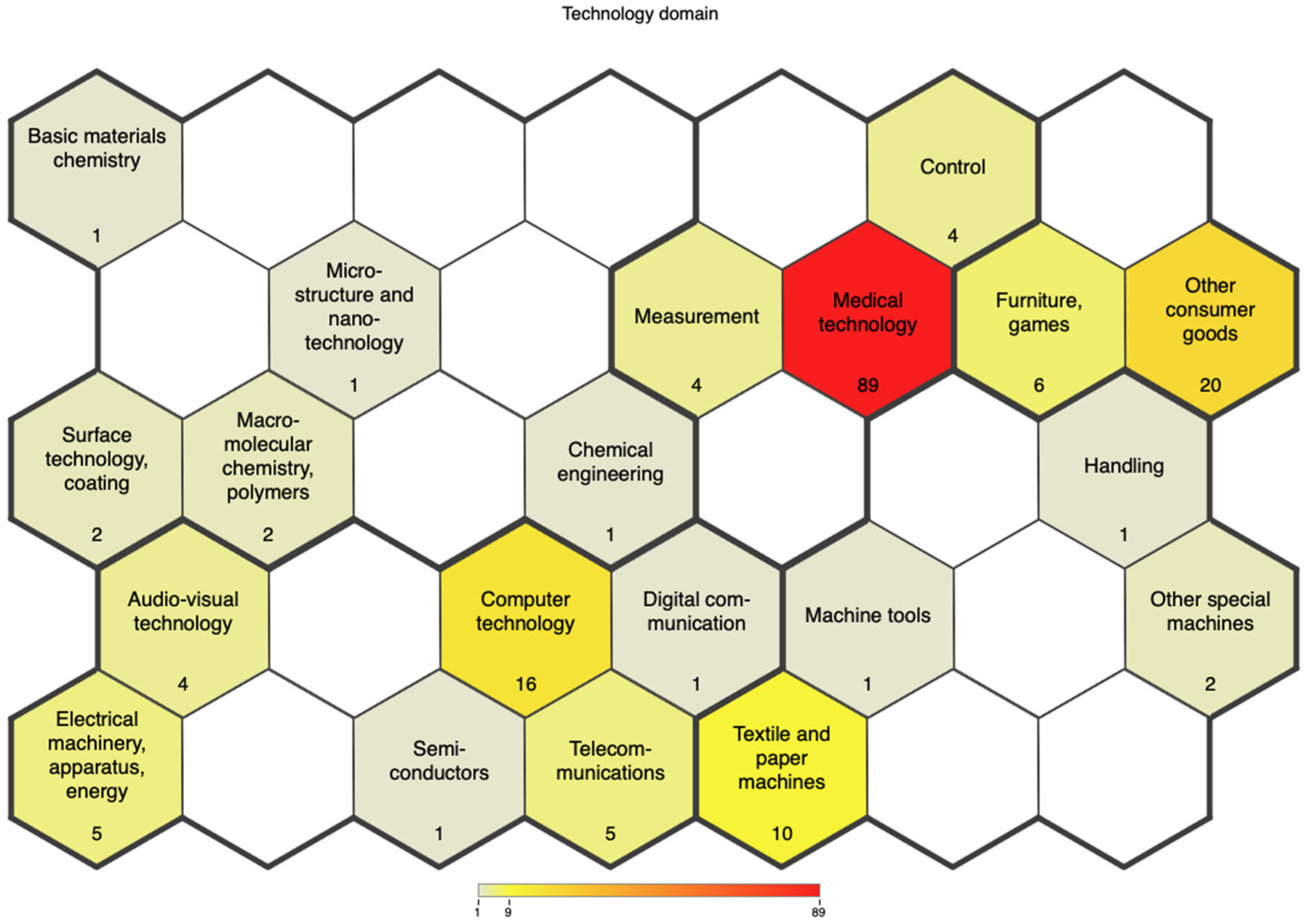A total of 89 patents are classified within the domain of medical technology, constituting the highest number of patents in the field and thus occupying the preeminent position in the search strategy’s technical areas. It is important to acknowledge that each patent may be classified across multiple technical domains.