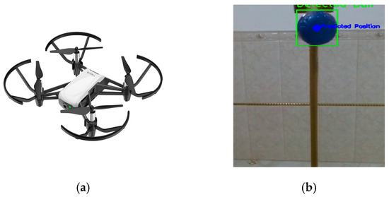 The UAV used in this study is a DJI Tello, as shown in Figure 1a (https://www.ryzerobotics.com/tello, accessed on 12 June 2025). Figure 1b depicts the ball used as the target in our system. The ball moves along a predefined trajectory, and the UAV’s task is to autonomously detect and continuously track it.