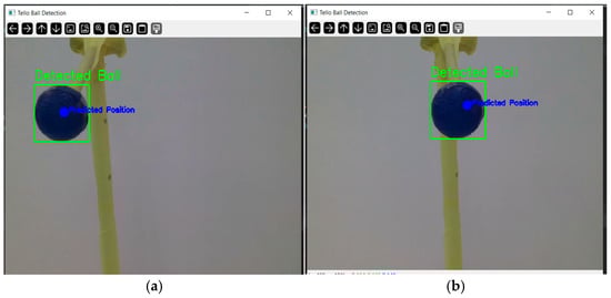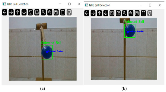 After detection, the UAV aligns with the ball to keep it at the image center and flies toward it. Figure 5 illustrates this process: in Figure 5a, the ball appears in the upper-left corner of the camera view; in Figure 5b, after tracking, the ball is centered in the frame.