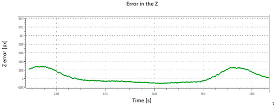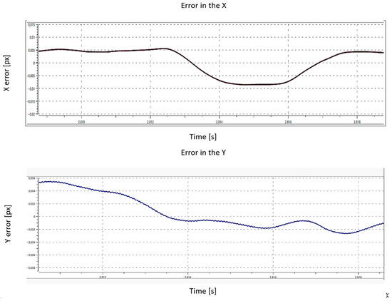 Figure 6 evaluates vertical tracking by moving the ball up and down, showing that the drone can follow these changes. In Figure 6a the ball appears low; after it shifts upward (Figure 6b), the PID controller drives the drone up to track and recenter the target. Figure 7 shows the response to each maneuver. When a change occurs, the tracking error briefly increases; then the controller quickly reduces it and returns the system to a stable state. These results indicate that the designed control system corrects disturbances effectively.