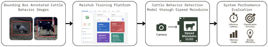 Precision livestock farming (PLF) represents a data-centric evolution in agricultural science, aiming to optimise both production efficiency and animal welfare through continuous, automated monitoring of individual animals [1]. The core premise of PLF is that high-resolution, real-time behavioral data empowers farm managers to make proactive, evidence-based decisions. In particular, deviations in diurnal activity patterns, such as lying, standing, feeding, and ruminating, often serve as early indicators of metabolic disorders, physical distress, lameness, or critical production events like estrus and parturition. Early PLF systems largely depended on labor-intensive visual observations. Subsequently, devices embedded with accelerometers and GPS have been extensively studied for tracking activity levels and pasture utilization [2]. More recently, computer vision has emerged as a compelling, non-invasive sensing modality. A single vision sensor can in principle not only determine posture but also identify individuals, assess body condition scores, monitor social interactions, and evaluate engagement with farm infrastructure such as feeders or water troughs. However, the widespread application of vision-based PLF has been constrained by significant computational requirements [3,4]. This computational barrier gives rise to Tiny Machine Learning (TinyML), a growing subfield of AI focused on executing inference pipelines directly on low-power, resource-constrained microcontrollers (MCUs) [5]. TinyML achieves this through efficient model architectures, advanced compression techniques like post-training quantization, pruning, and model distillation, and increasingly capable specialized hardware. Notably, post-training quantization, converting 32-bit floating-point parameters into 8-bit integers (INT8), dramatically reduces model size and enhances inference speed on compatible hardware with minimal loss in accuracy. The emergence of low-cost embedded AI platforms, such as the Kendryte K210 SoC with an integrated KPU, reflects a shift in embedded AI capabilities [6]. These platforms enable efficient on-device execution of quantized models, allowing complex visual inference at the deep edge with low cost and milliwatt-level power consumption [7]. The K210 and its underlying RISC-V architecture have seen diverse applications ranging from waste monitoring and face mask detection to precision agriculture and traffic management [8,9,10]. In the realm of livestock monitoring specifically, several studies have explored TinyML-based approaches, including systems focused on cattle behavior recognition, on-device feeding analysis, and multi-modal sensing [11,12,13,14,15,16,17,18].