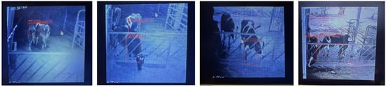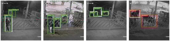 Model predictions were evaluated using annotated bounding boxes (white), predicted boxes (green), and incorrect detections (red). Correct detections occurred when predicted boxes overlapped with annotated targets, even if not all instances were recognized. As shown in Figure 3, the model successfully identified multiple behaviors (standing, eating, sitting, drinking) with high confidence scores (0.9–1.0). However, cases of misclassification and partial recognition were observed, especially in crowded scenes or low-light conditions, where multiple animals overlapped or when visibility was reduced.
