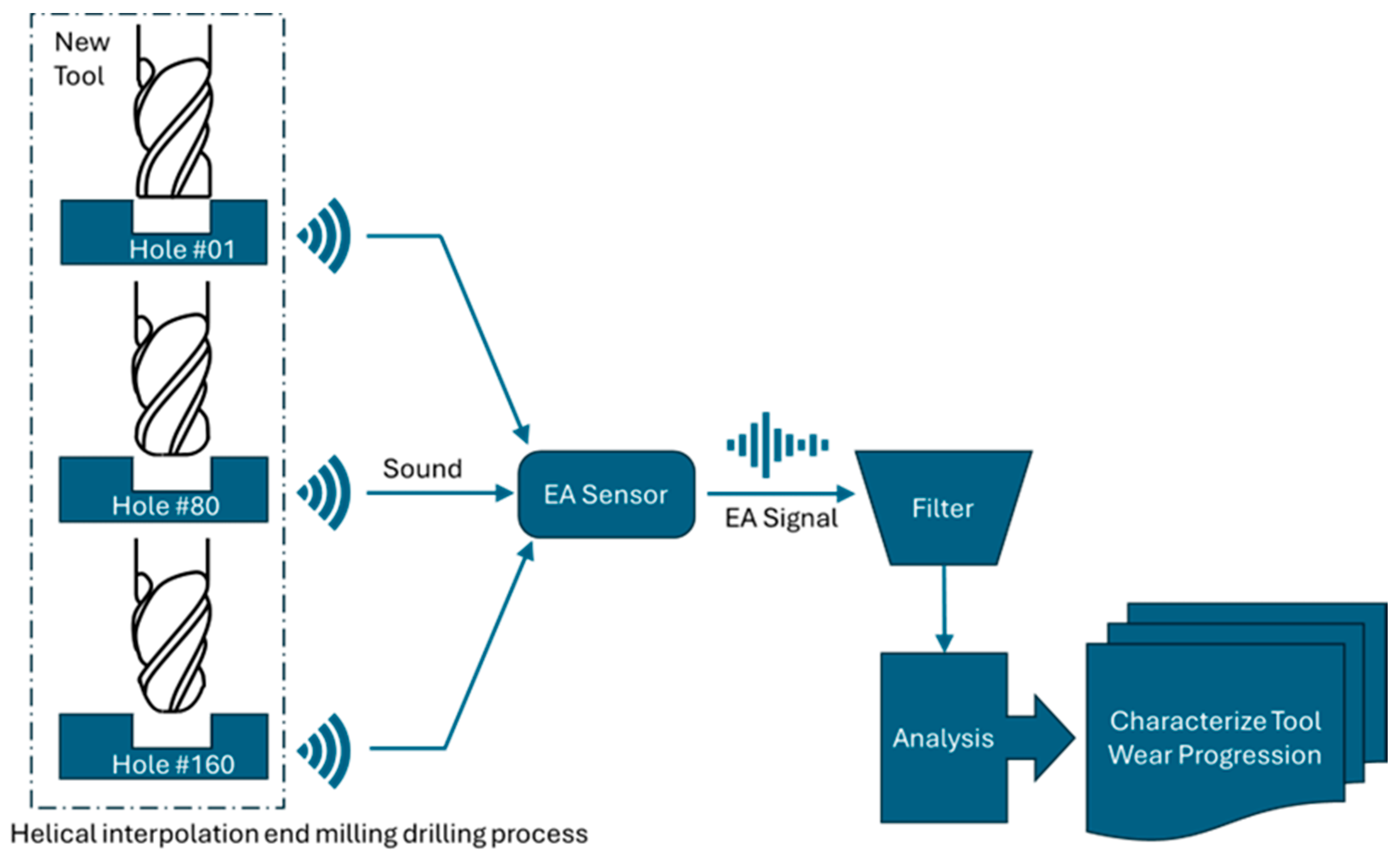 For this work, a setup for a helical interpolation end milling drilling process was performed using a carbide helical milling cutter with a diameter of 10 mm, a length of 100 mm, a helix angle of 35°, 4 flutes, coated with titanium carbide nitride, and a hardness of 50HRC on a CFRP composite plate. It was decided to measure the tools every 80 holes, with 77 wear holes on the designated plate, 3 holes for acoustic signal collection on a designated plate, and two plates per tool. This is the machining and measurement cycle adopted. Three initial holes were drilled with each tool to serve as a reference. After data collection using the acoustic sensor, holes were machined in five carbon plates was used to characterize tool wear progression, as shown in