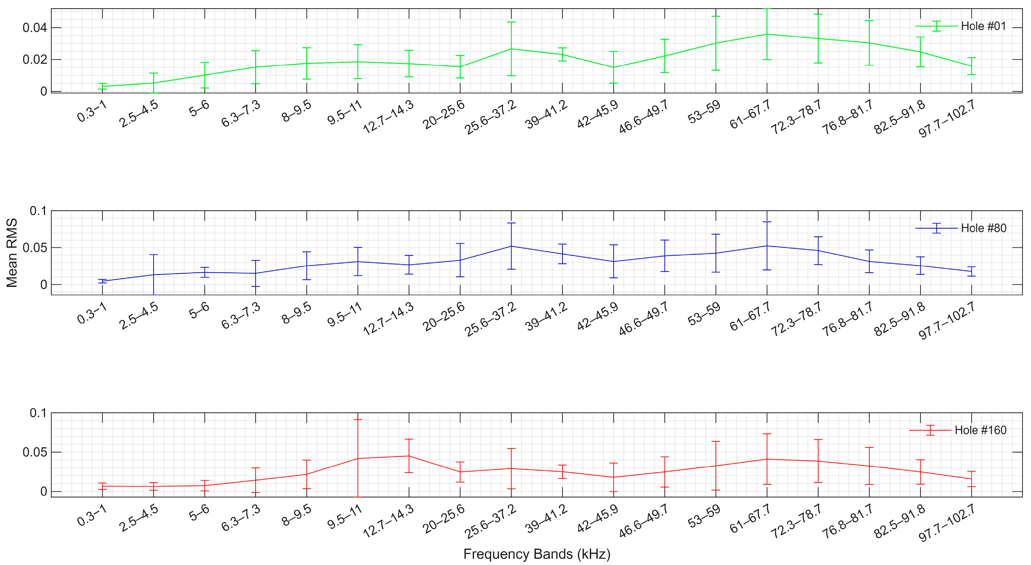 Figure 5 illustrates how the RMS energy varies with machining evolution, enabling the identification of frequency bands that best distinguish between the three conditions. Again, the Hole #160 exhibiting higher amplitudes, highlighting the activity associated with tool wear.