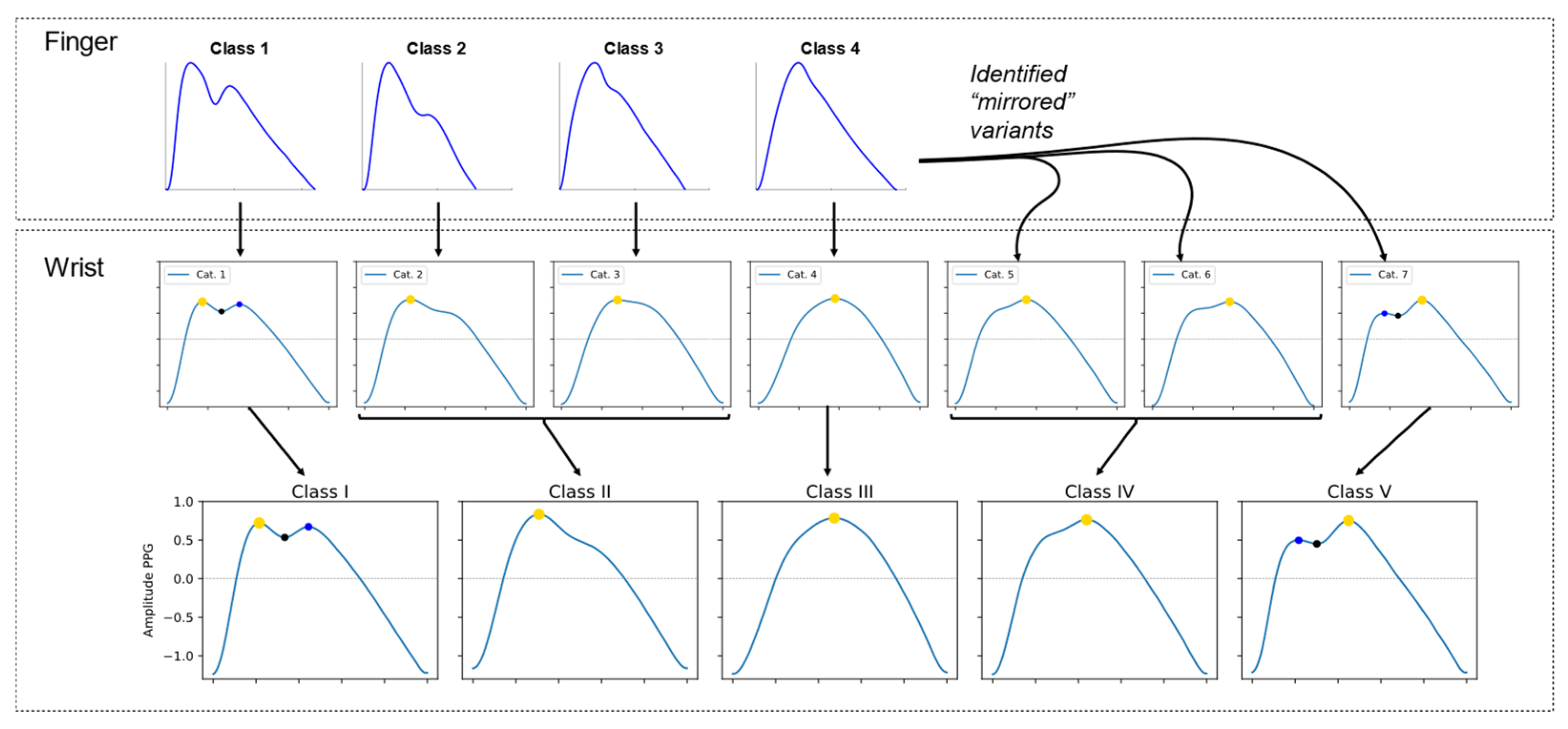 15]. Pulse wave classes were illustrated visually with representative examples and described mathematically. The newly proposed wrist-PPG classes were compared with those previously proposed for the finger-PPG.