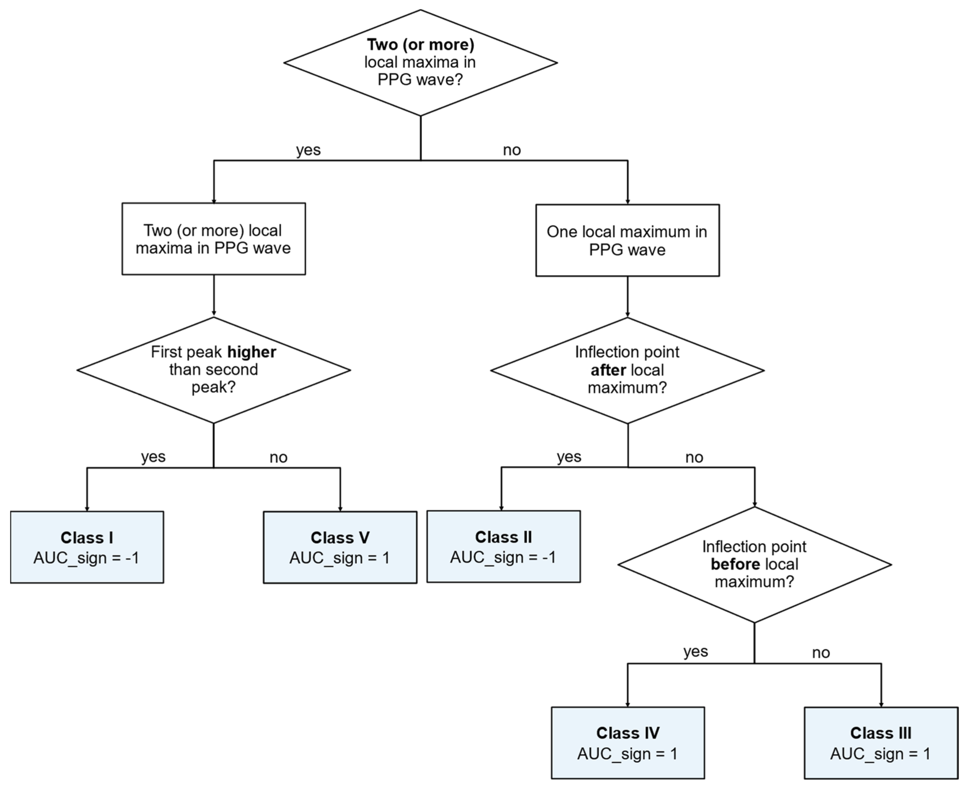 An automated algorithm was developed to classify wrist-PPG pulse waves as follows. First, the morphology of each pulse wave class was described in terms of the number of peaks in the pulse wave, their relative amplitudes, and (in the case of pulse waves with only one peak) the position of the inflection point in relation to the peak. Second, a decision tree algorithm was designed to classify pulse waves according to these characteristics. Third, the algorithm was extended to quantify the ‘sharpness’ of the notch between the first and second peaks using the AUC parameter. This enabled a continuous measure of pulse wave shape, in addition to the categorical measure provided by the pulse wave classes.