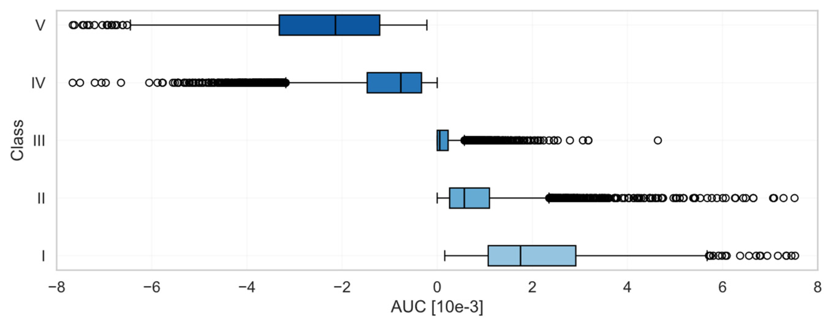 Distribution of AUC by class, displaying the AUCs from all individual waves from all individual subjects. X-axis truncated to [−8 × 10−3, 8 × 10−3]; outliers beyond limits not shown.