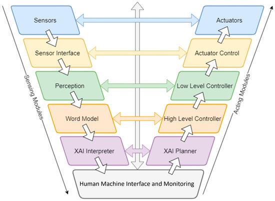 A V-model-based autonomous driving software architecture, which incorporates an explainable AI layer, is presented in Figure 1 [13]. This structure consists of five main layers, each designed hierarchically to include a perception and an actuator module. The Human–Machine Interface (HMI) and Monitoring Module, located at the lowest level, not only enables user interaction but also ensures that the system operates with minimal error. While the information flow between layers is defined sequentially, the HMI and Monitoring Module is uniquely designed to communicate directly with modules across all layers.