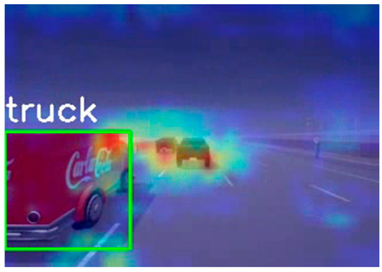 In deep learning models, not every pixel from camera images contributes equally during the prediction phase. Instead, the model selectively focuses on the most informative regions of the input, known as attention maps, which highlight the areas deemed most relevant for decision-making. This is useful for image classification and object detection. Thus, it makes the prediction made when looking at the model’s output more interpretable and explainable. In line with these explanations, the combination of Faster RCNN and Grad Cam applied to an image obtained from the vehicle’s camera looks like in Figure 3.