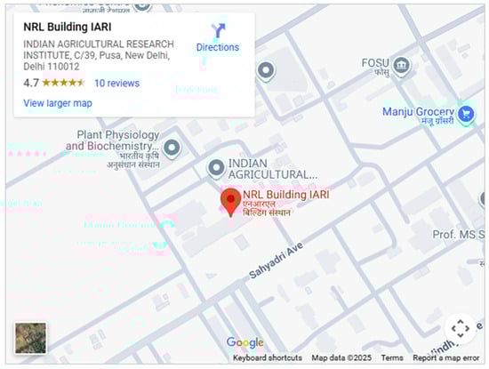 ICAR-Indian Agricultural Research Institute (IARI) is a leading agricultural research centre located in New Delhi, India. It has several essential facilities for research on various agricultural topics. One such facility is the Big Data Analytics Lab (BDL Lab) (28.639541, 77.162105). The BDL lab uses remote sensing data from ground sensors, UAVs, and satellites to evaluate crop health in different ways. The study was conducted at the Big Data Analytics lab, where the MX sensor was used to assess the health of potted plants. Crops in the pots were subjected to multiple treatments to see their reaction to nutrient and water stress treatments. The MX sensor was applied to assess the impact of these treatments as a remote sensing sensor. The problem of parallax error was first observed during the initial image alignment and layer stacking process. The methodology applied here will address the image alignment issues so that the health of these potted plants can be assessed from the MX images. Figure 1 shows the location of the BDL lab inside IARI.