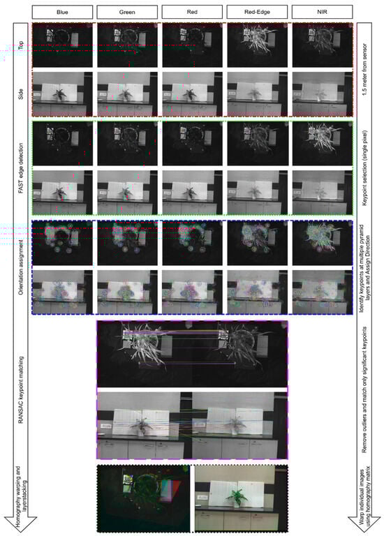 Shows the steps involved in layer stacking the individual images from the Micasense Rededge-MX sensor using Oriented FAST and Rotated BRIEF (ORB) computer vision techniques.