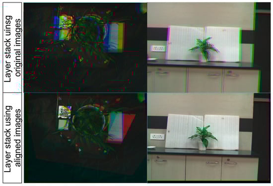 The close-up images of the potted plants taken from the MX sensor were processed using the methodology mentioned above. A layer stack of these bands was generated using QGIS 3.40 LTS version; the outcome of the process is shown in Figure 3. Figure 3 shows the layer-stacked true colour composite (TCC) image of the front and side view images before and after alignment. Before the alignment, the shift between the bands is visible in both the front and side view images. After the alignment, too, the top-view image shows a lot of shit between the bands. The image taken from the nadir position has a uniform background with markers to identify the edge, which the feature detection algorithms can use to improve alignment. In addition, the image also has high-contrast edges that can make the alignment process more accurate. But in this case, the ORB failed to provide a proper alignment [28], and from Figure 3, the aligned top-view image looks very similar to the original layer-stacked image, except for some zones.