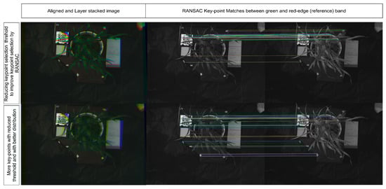 Though most of the aligned images from the nadir view have lapses, some features, like the reflectance panel, show near-perfect alignment. This indicates that the image went through the alignment process, features were detected, but the alignment failed to produce a perfectly aligned layer stack. One strong reason could be that the key points are mainly concentrated in and around the reflectance panel area of the top-view image. From Figure 2, the key points in the blue, green, red, and red-edge bands clearly show that most of the key points are situated near the panel area due to its high contrast edges. Since FAST detects only the edges and ORB only uses these key points for further processing [29], all the key features are concentrated only in a small zone. Further, RANSAC utilises these features to formulate the transformation matrix for aligning the images (see Figure 2, RANSAC key point matching). Since the algorithm failed to detect a large no of key points on the crop, the alignment process warped the images along the available key points, resulting in a near-perfect reflectance panel layer stack, disregarding the rest of the image. Thus, the lack of contrast between the crop and the background, along with having high contrast edges concentrated in a single zone, could have caused the ORB algorithm to fail in image alignment [30].