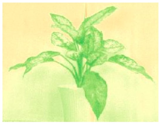With these learning, the MX sensor was used to capture the side-view image of an indoor potted plant with diverse backgrounds and bright indoor lighting conditions. Figure 2 shows how the pot looks in different bands. The figure also shows the key points detected in each band. From the figure, the key points in the side view image are spread across the image, with several of them being on the plant and the pot itself. The edges and high contrast features are spread across the side-view images, thus providing well-distributed features at prominent positions. The RANSAC matching also shows highly diverse matching lines connecting the well-distributed features, indicating how the high-quality key points can influence the alignment process. The results of the alignment can be seen from the images displayed in Figure 3 (bottom-left). The figure shows the TCC of the side-view layer stacked image without alignment (top-right) and the layer stacked image after alignment (bottom-right). From the figure, the TCC of the unaligned image shows a significant shift between the bands. In contrast, the TCC of the aligned image show a perfect layer stack where the alignment process was able to align the bands to near perfection. This layer stack image can be used to perform an analysis of choice to extract crop health information. Figure 5 shows the normalised difference vegetation index (NDVI) image generated from the stacked image layer. The image is colour-coded from red to green, where red indicates very low NDVI and green indicate higher NDVI. The minimum and maximum values of NDVI for the plant are around 0.1 and 0.7 [33]. The leaf of the indoor plant has several pale green spots where the chlorophyll is very low, and some areas are still bright green where the chlorophyll content is high. The NDVI image clearly shows a difference between the zones with lower chlorophyll content and the areas with high chlorophyll content in the leaves [34]. Wherever the chlorophyll content is low, the NDVI values are low and vice versa [35]. Since the NDVI is showing all these variations accurately per the plant chlorophyll content, it clearly shows that the alignment and layer stacking of the image worked perfectly. Thus, the MX sensor can be used effectively for assessing crop health from a very close distance, provided some precautions are taken before capturing the images.