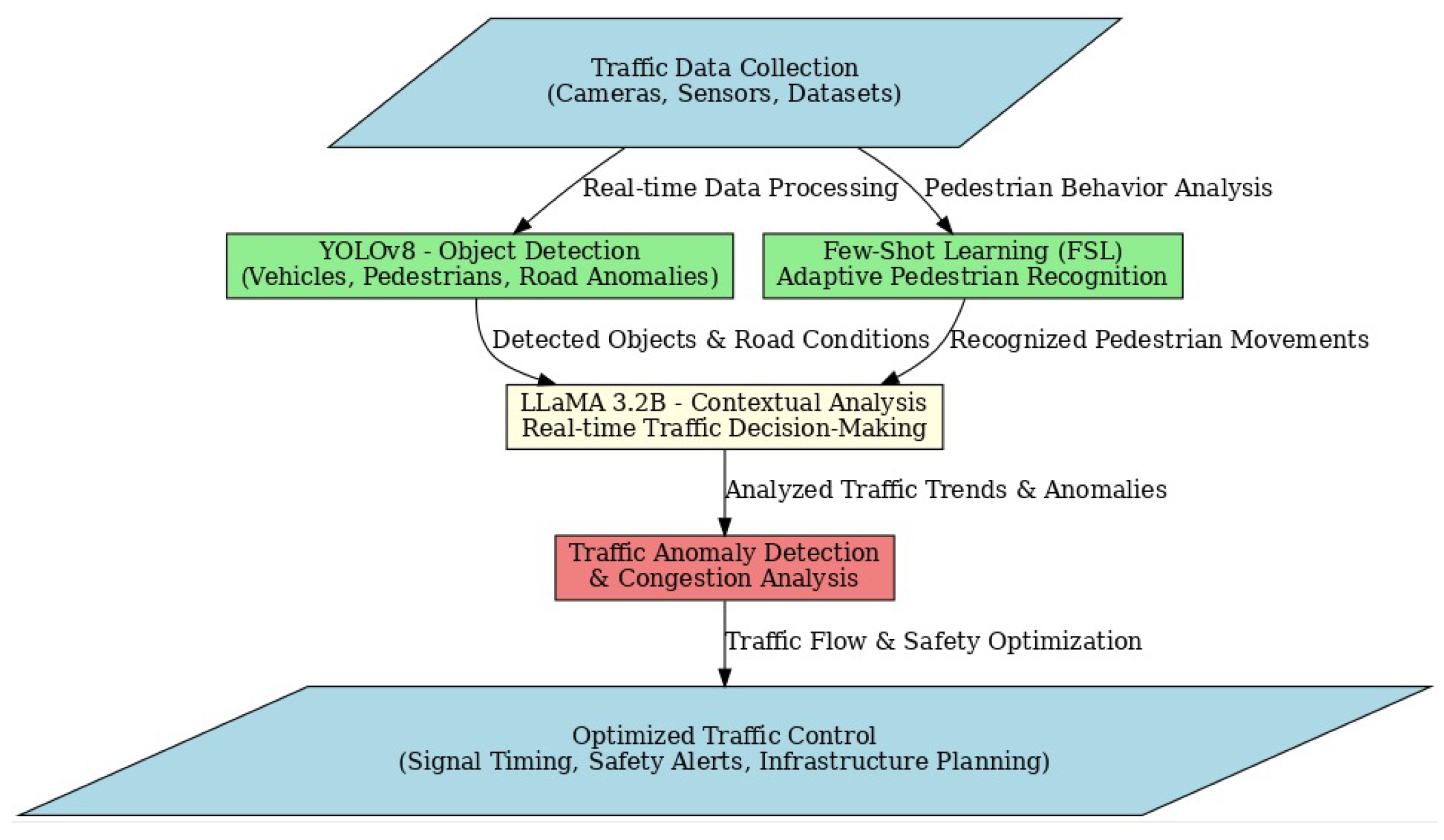 The dataset includes labelled instances of vehicles, roadblocks, crossings, and traffic signals for object detection using YOLOV8. The bounding boxes and class labels of each image are defined. Firstly, the dataset is processed by removing noise and normalising the resolution, and is then used for training and fine-tuning the model. The system’s overall accuracy and real-time responsiveness are enhanced by combining large-scale labelled data and domain-specific adaptive learning. YOLOv8 FSL and LLaMA 3.2B are integrated into the proposed system to enable real-time traffic monitoring and pedestrian detection. The architecture contains three main components: (i) YOLOv8 for object detection, (ii) Few-Shot Learning for adaptive pedestrian detection, and (iii) LLaMA 3.2B to opt for real-time decisions. Each of these components analyses the traffic conditions, detects anomalies, and predicts potential road safety risks based on historical patterns, as shown in