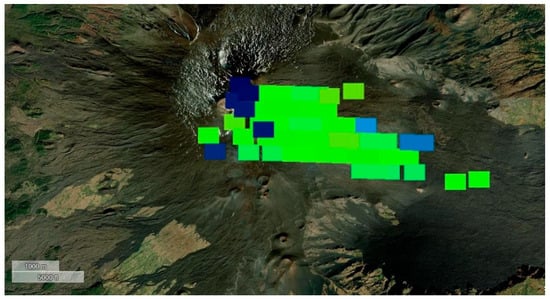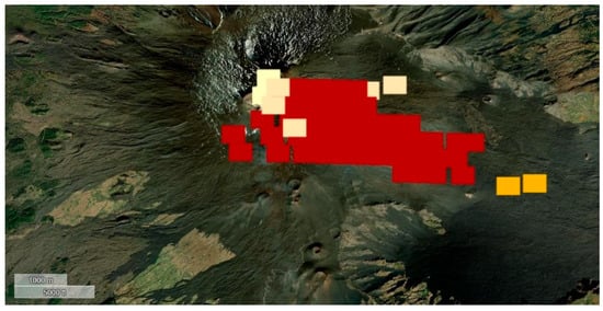 To estimate the severity of the volcano’s activity, both sensors are employed at a larger spatial resolution, which corresponds to the adjustments of the optical view camera. For a better understanding, we present an experiment in Figure 3, in which the spatial resolution is equal to 10 km. It is clearly seen that the severity of the eruption is regionally labeled from yellow (low) to orange (high). Such results allow for better human monitoring of the hazard.