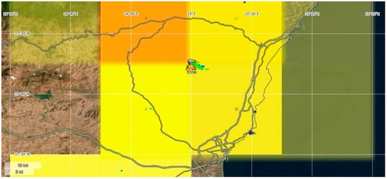 The macro-visualization of Etna volcano (the spatial resolution is 10 km). All green-blue color nuances (seen in Figure 3) are clearly displayed. The severity of the eruption of the volcano is labeled by yellow (low) and orange colors (high).