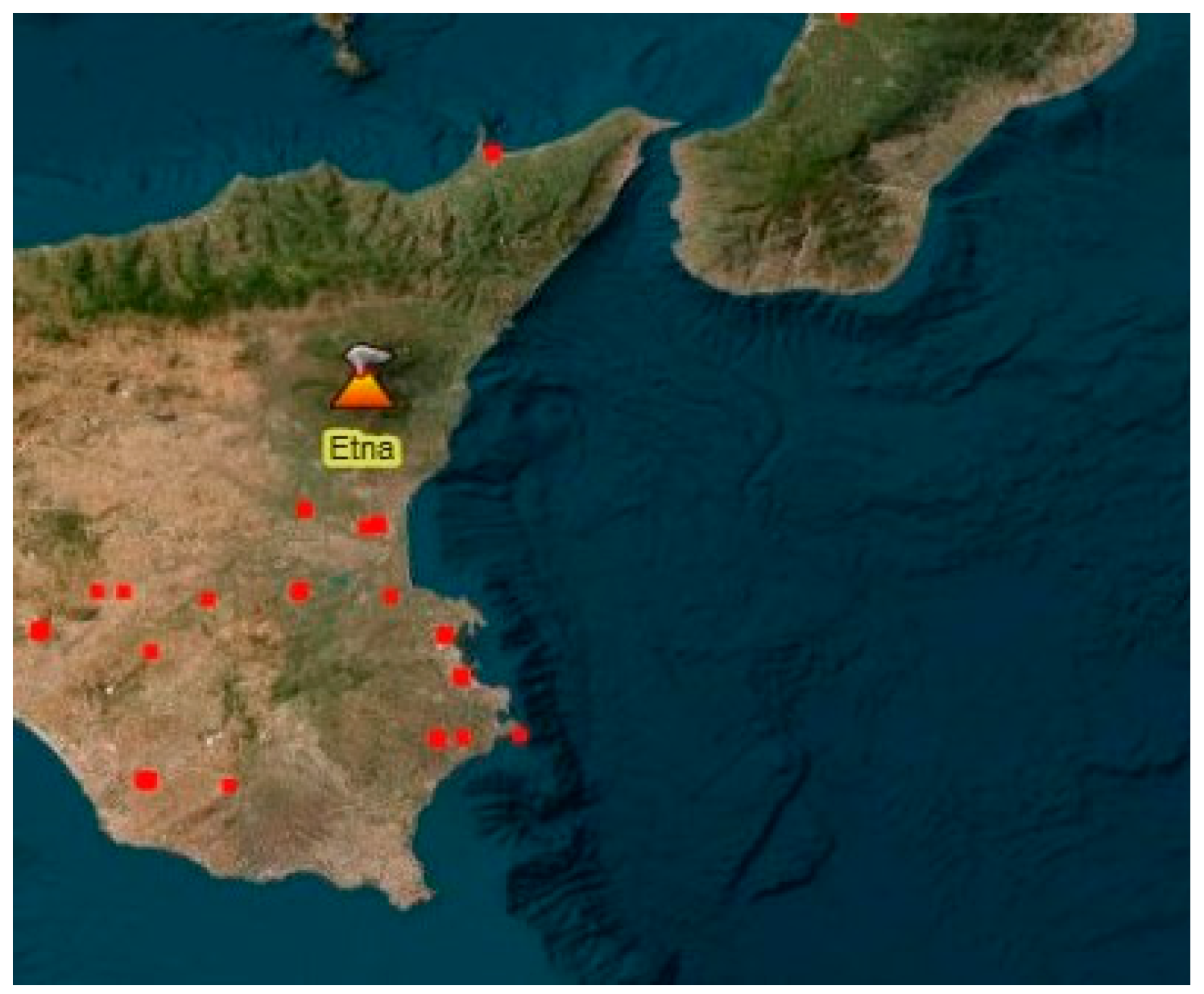 - Malaguti, A.B.; Corradino, C.; La Spina, A.; Branca, S.; Del Negro, C. Machine Learning Insights into the Last 400 Years of Etna Lateral Eruptions from Historical Volcanological Data. Geosciences 2024, 14, 295. [Google Scholar] [CrossRef]