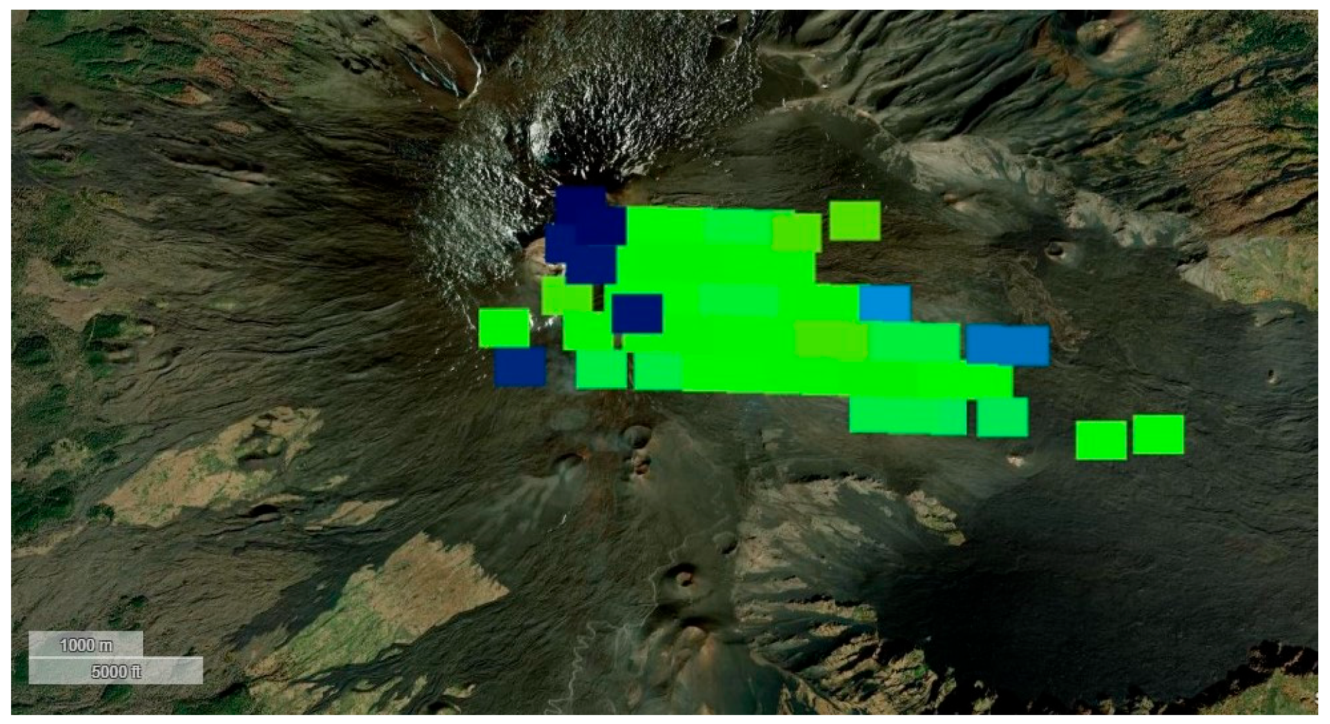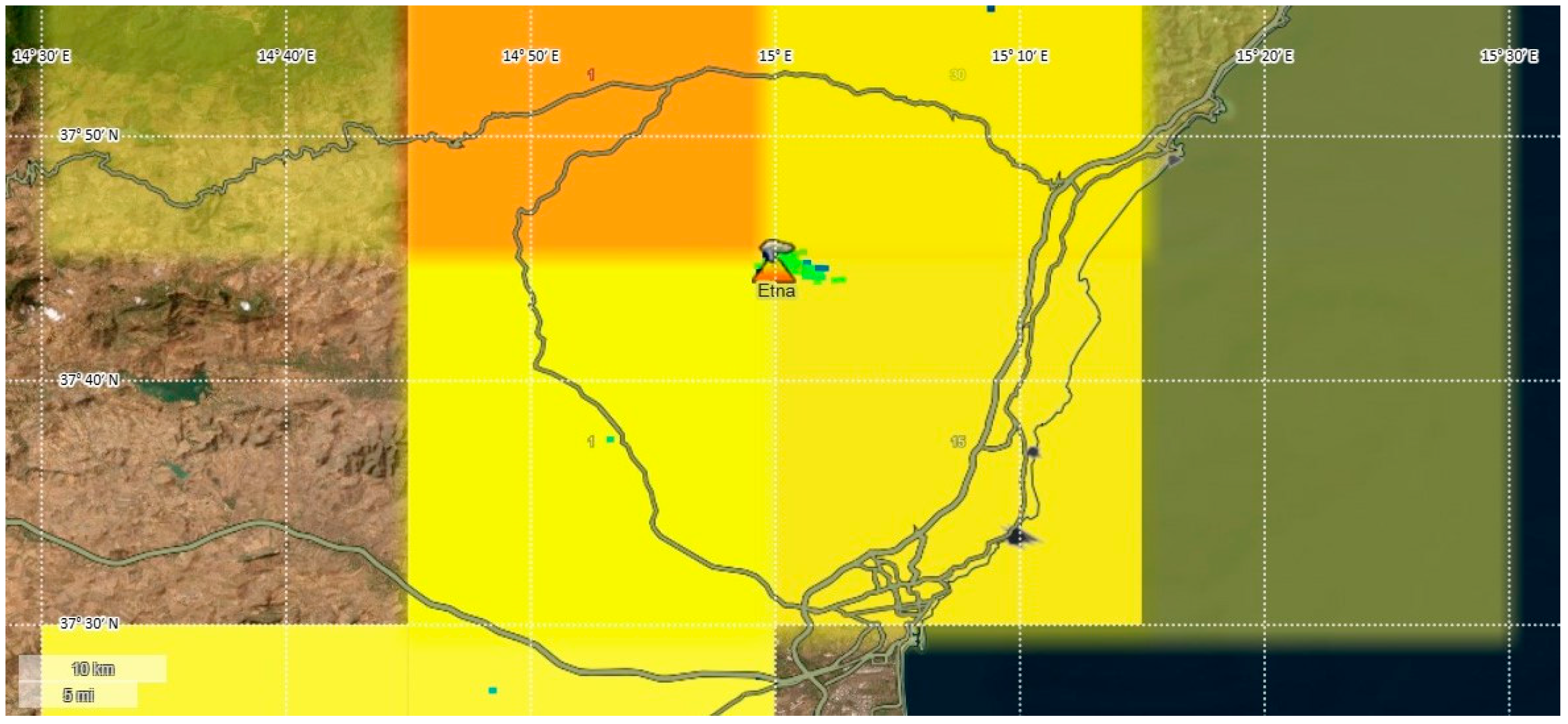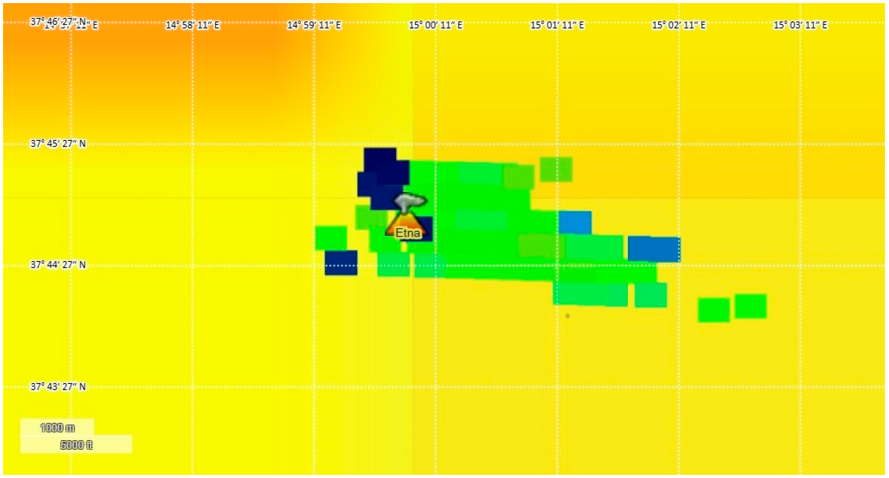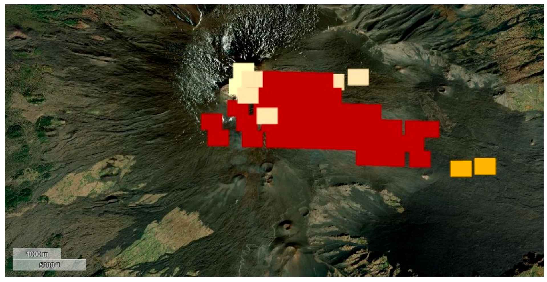 - Ganci, G.; Bilotta, G.; Zuccarello, F.; Calvari, S.; Cappello, A.A. Multi-Sensor Satellite Approach to Characterize the Volcanic Deposits Emitted during Etna’s Lava Fountaining: The 2020–2022 Study Case. Remote Sens. 2023, 15, 916. [Google Scholar] [CrossRef]